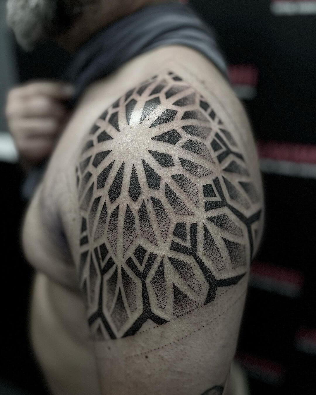 Dotwork bedeutet „Punkt-Arbeit“. Dein Tattoo wird aus einer Vielzahl winziger Punkte zusammengesetzt. Das siehst du aber nur aus der Nähe. Aus der Distanz wirken die Farbflächen total realistisch, Schattierungen inklusive. Farbflächen? Ist Dotwork nicht Black and Grey? Dotwork beschreibt den Zeichenstil, in dem das Tattoo gearbeitet ist. Das kann Black and Grey sein, kann aber auch farbig daherkommen. Geometric, Mandalas, Ornamente, alles ist möglich. Für feinste Arbeiten legen Dotwork-Artists ihre Maschine zur Seite und arbeiten von Hand. Das ist eine echte Kunst!