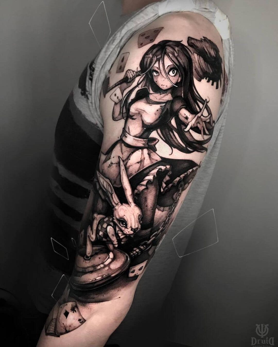 Atemberaubende Tiefenschärfe, detailliert ausgearbeitete Schattierungen und das Flair einer kunstvollen Schwarz-Weiß-Fotografie – das ist der Stil Realistic Black and Grey. Die Motive müssen keine realen Gegenstände oder Fotografien zeigen. Erlaubt ist, was gefällt – von deinen Helden aus Kino, Serien und Games über dein Haustier, Familienmitglieder (Stichwort Porträt) bis hin zu eigens für dich entwickelte Motive. Ihren Ursprung haben die Black and Grey Tattoos der Legende nach in amerikanischen Gefängnissen. Aus den einfachen Symbolen entwickelte sich der heute bekannte Realismus.