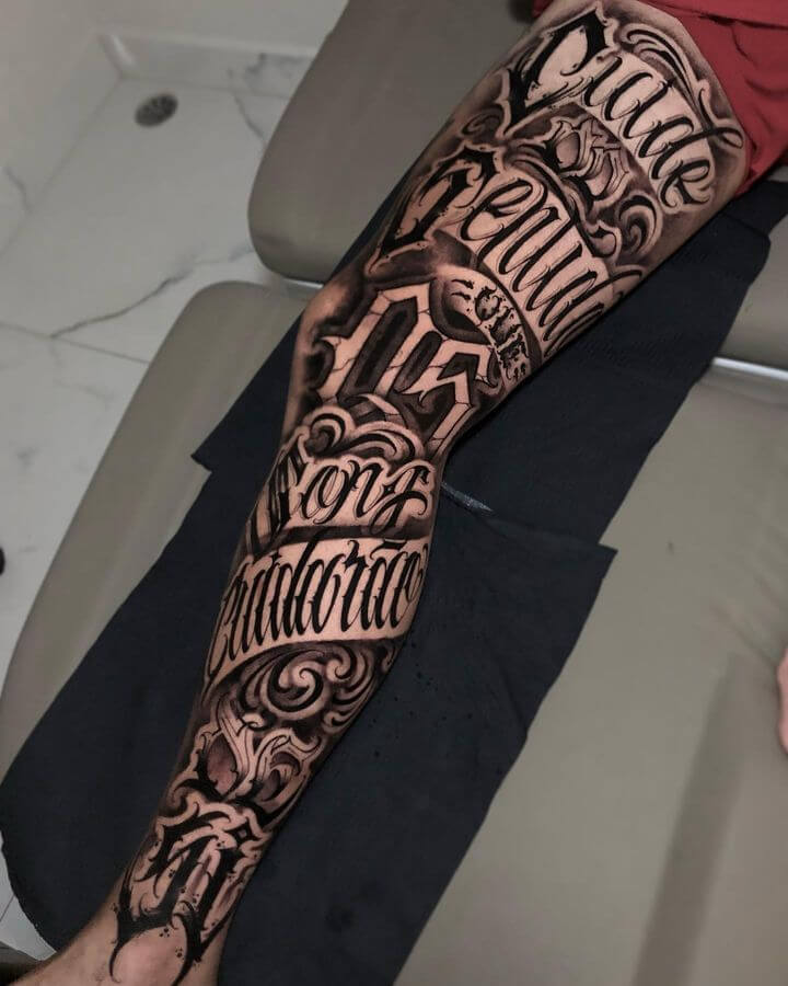 Die tätowierten Wörter, Schriftzüge, Daten oder Zahlencodes bezeichnen wir als Tattoo Letterings. Wie genau der Schriftzug verläuft, hängt von der Körperstelle ab, an der das Tattoo erscheint. Schriftart und Schriftverlauf werden der Körperstelle also individuell angepasst. Wichtig ist, dass Du dem Künstler oder der Künstlerin wirklich vertraust. Denn die Schriftart wird mit Blick auf die Dreidimensionalität Deines Körpers ausgewählt. Die Schriftarten, die Du aus Büchern und aus dem Internet kennst, sind für zweidimensionale Trägermedien entworfen und wirken auf dem menschlichen Körper nicht. Tattoos mit Schriftzügen, Worten und ganzen Sätzen erfreuen sich heutzutage großer Beliebtheit. Jedoch gibt es deutliche Unterschiede in der Umsetzung von Lettering unter der Haut. Ein wirklich einzigartiges Tattoo entsteht, wenn der Tätowierer eure Beweggründe versteht und verinnerlicht hat und frei Hand die Linien setzt. Im Beratungsgespräch entwickelt ihr gemeinsam eine Vision. Eine Idee entsteht, die dann mithilfe der Tätowiermaschine und der Nadel auf eure Haut gebracht wird. Vertrauen und ein tiefgreifendes Verständnis sind dabei von größter Bedeutung. Daher nehmt euch die Zeit, die wir euch zur Verfügung stellen, und besprecht mit eurem ausgewählten Künstler jedes einzelne Detail eingehend.
